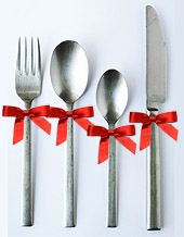 Para resolver a mistura de talheres de diversos aparelhos, coloque um lacinho de fita que dá charme e iguala. Copos antigos e descasados também podem ser aproveitados numa bandeja de canto com bebidas para os convidados se servirem.