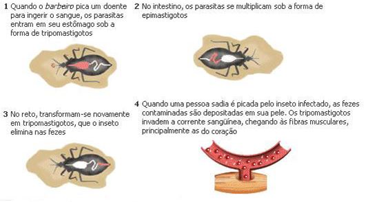 Doença de Chagas - Parasitose causada por um protozoário flagelado, o Trypanosoma cruzi, transmitido ao homem por um inseto hematófago, chamado popularmente de barbeiro. Tem esse nome por ter sido identificada pelo brasileiro Carlos Chagas, é endêmica na maior parte das áreas rurais da América Central e do Sul, principalmente no Brasil, Argentina e Chile. A contaminação dos tecidos da pessoa picada pelo barbeiro se dá de duas maneiras: parte dos parasitas entra na corrente sanguínea e parte se aloja na conjuntiva, para onde são levados pela própria pessoa, ao coçar o local da picada e esfregar os olhos.