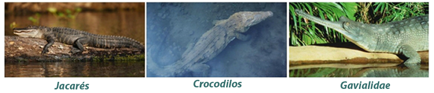 - Jacarés e caimãos: vivem na água doce;