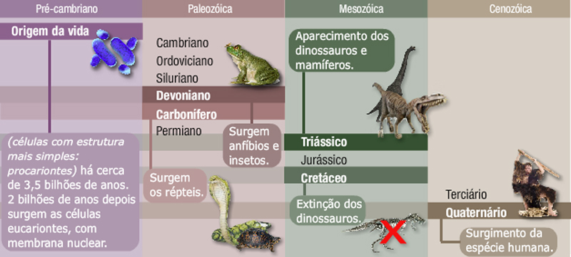 Origem da vida (células com estrutura mais simples: procariontes): há cerca de 3,5 bilhões de anos. 2 bilhões de anos depois surgem as células eucariontes, com membrana nuclear.