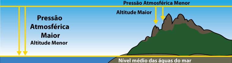 Mas, tem outra coisa que influencia bastante a pressão atmosférica: a altitude. Se você está localizado em pontos elevados, a pressão é menor, afinal, a coluna de ar que está sobre as nossas cabeças também é menor.