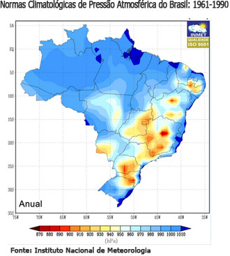 No Brasil, como um todo, as pressões são baixas. Mas, comparando uma região com outra, observe que aquelas que apresentam um relevo mais elevado, como Sudeste e Sul, contam menores índices de pressão atmosférica.