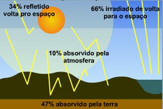 O Sol emite a radiação que chega até a Terra e pode ser absorvida e refletida. Somente 31% da radiação solar atinge a superfície terrestre. O restante dessa radiação, cerca de 30%, é refletida pelas camadas de nuvens e volta para o espaço e 6% é refletido pelo solo. Cerca de 15% é absorvido na atmosfera, pelo vapor de água, CO2 e partículas (aerossóis), aproximadamente 3% é absorvido na ionosfera, na formação do ozônio e finalmente cerca de 15% da é dispersado pelas partículas sólidas e gasosas.