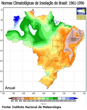 Quanto mais vermelho, maior é a insolação. Já as cores verdes e azuis demonstram uma insolação menor.