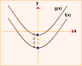 Vemos que elas possuem concavidade para cima, pois o coeficiente a é positivo em ambas. Mas observe os pontos de interseção com o eixo y: (0,-4) em f(x) e (0,-1) em g(x).